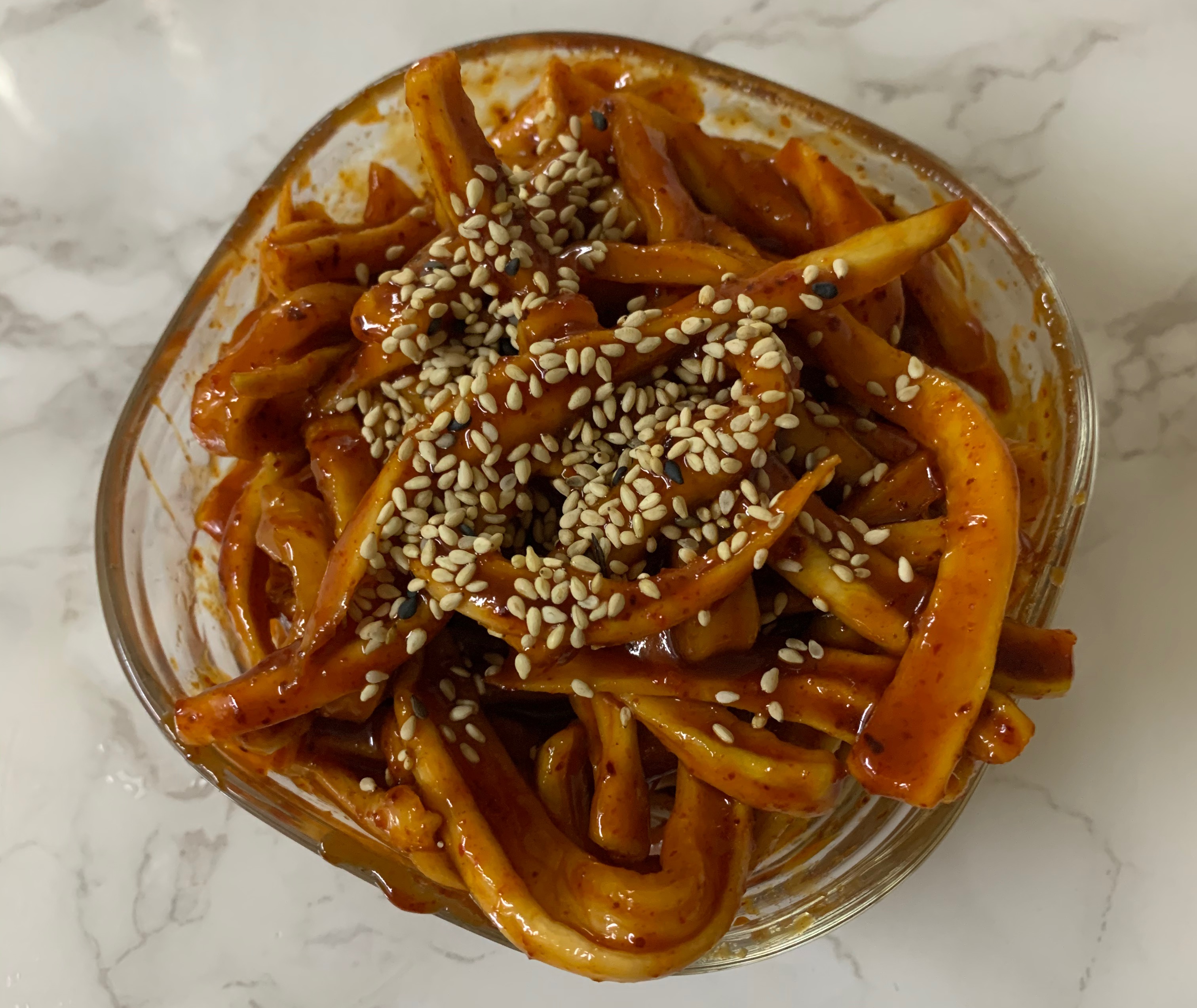 오래끓이면 수분이 날아가 양념장이 매우 뻑뻑해져서 잘 무쳐지지않습니다.
