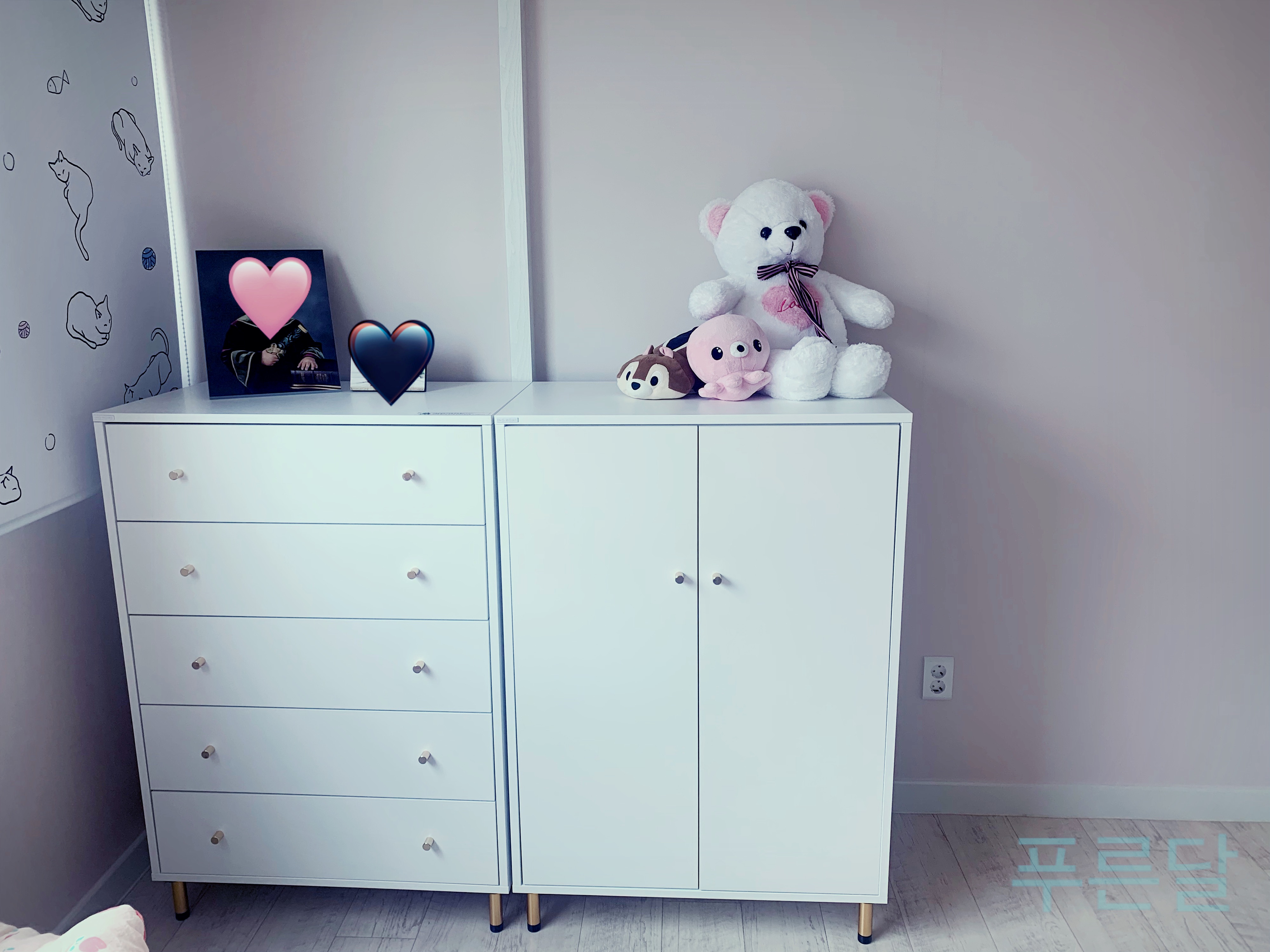 아이가 옷장 위가 허전하다며 액자를 얹어달라고 하더니 그걸로도 만족할 수 없었는지 그 옆에 인형을 올려두었다.